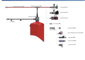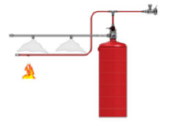 A most efficient and self-activated system for larger and even open hazard areas. Upon flame impingement or heat the pressurized sensor tube which again is connected to a cylinder will burst and by depressurization will activated the cylinder valve to open. The agent then is released throught seperate pipe work and nozzles which are aiming at the hazard area. Flexible and fast acting